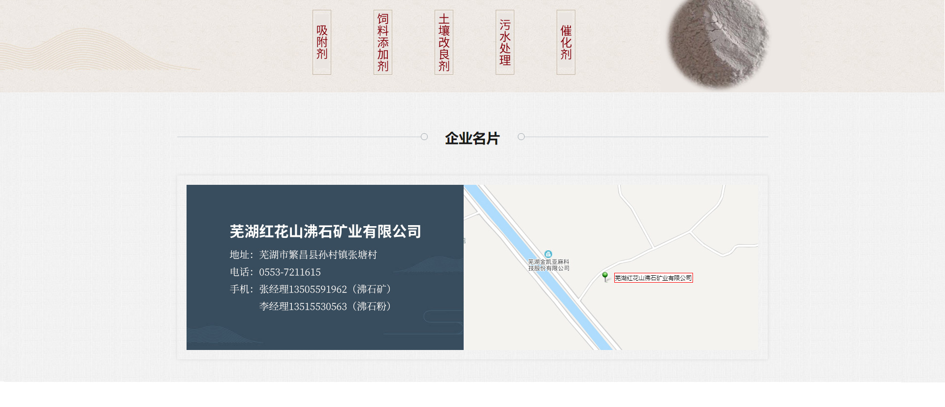 蕪湖紅花山沸石礦業(yè)有限公司距繁昌縣約18公里,有公路直達礦區(qū),距滬銅鐵路線的繁昌站、楓香墩站約20公里,礦區(qū)西側(cè)的赤沙河道直通荻港至長江,水路交通地理位置好。沸石是硅氧、鋁氧四面體構(gòu)成的架狀硅酸鹽,有較大的比表面積和孔體體積。我礦沸石經(jīng)321、803地質(zhì)隊勘探儲量約一億噸以上,主要為絲光沸石(Ca、Na、K2)【ALSi2O2】27H2O,此外還含有石英、蒙脫石等,經(jīng)合肥工業(yè)大學、蕪湖市科委、華東冶金地質(zhì)礦產(chǎn)研究所、南京地礦研究院等單位測試測定沸石含為55%—68%。